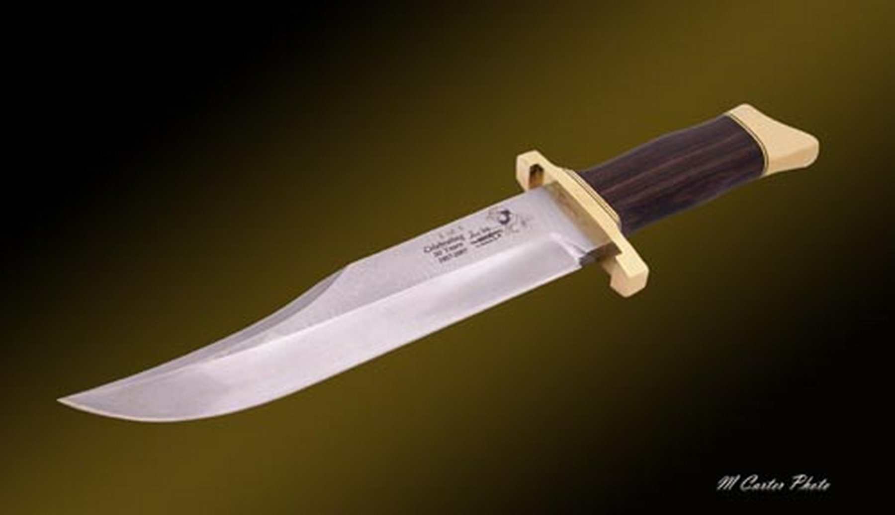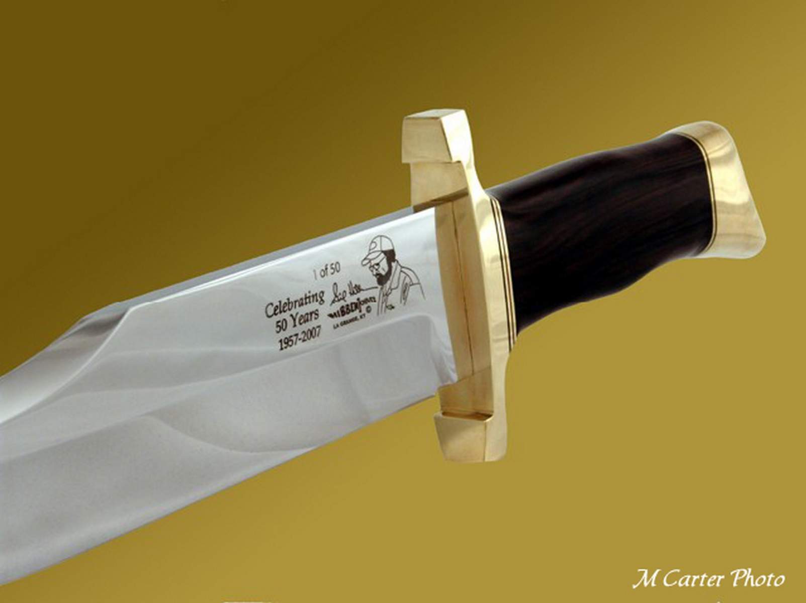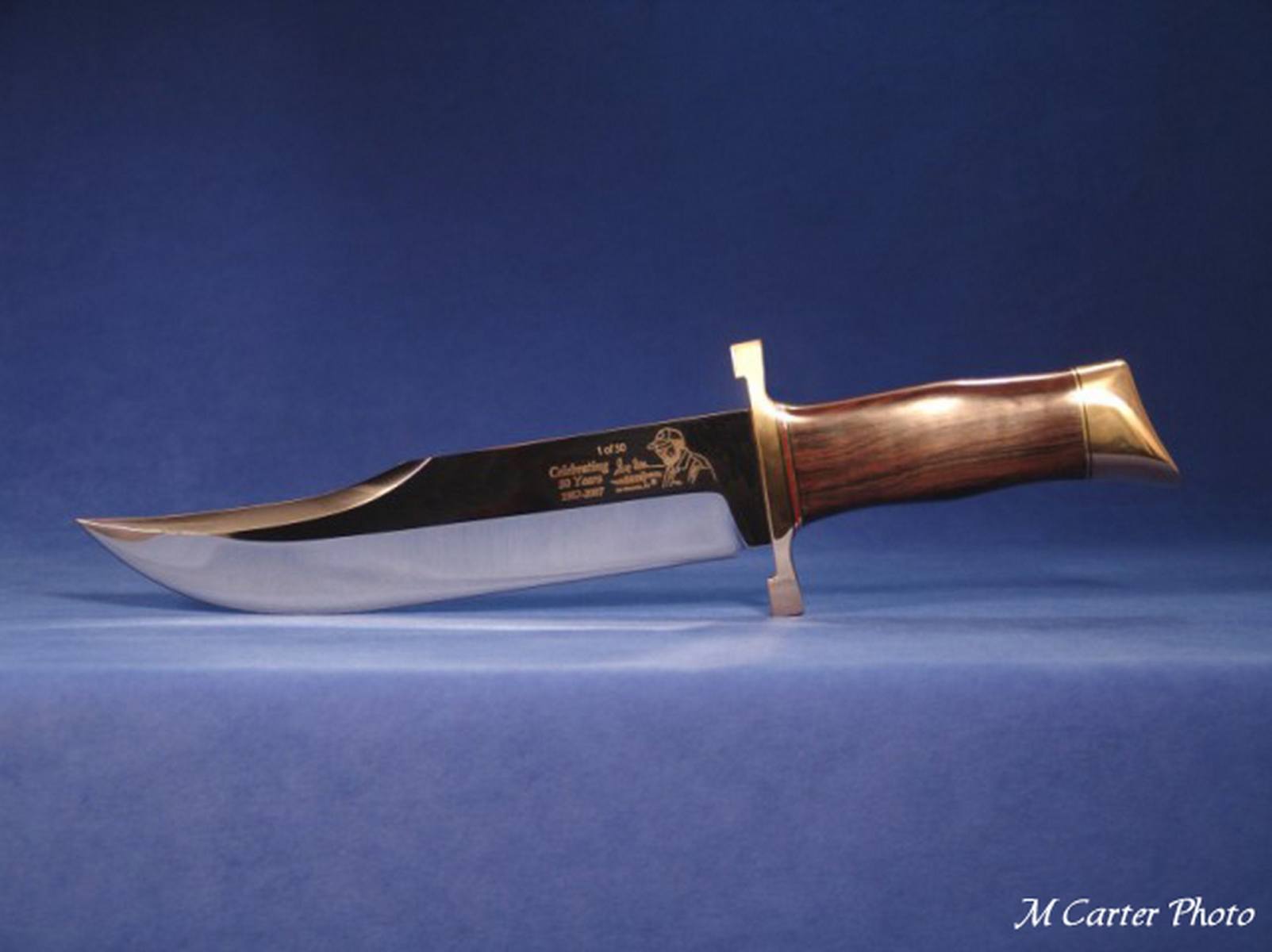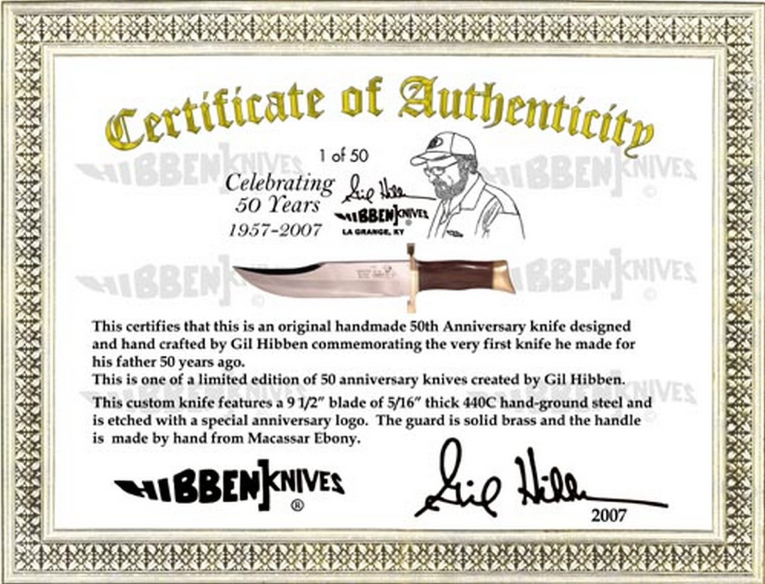 In 1957 Gil Hibben began his career as a custom knifemaker. This limited edition 50th Anniversary knife is similar to his Southern Bowies that Gil made in the early years. This very special Anniversary Edition knife is strictly limited to 50 stainless steel knives to commemorate Gil’s 50 years as a knifemaker. In addition, he will make only 5 Damascus steel versions commemorating his 5 decades of custom knifemaking.