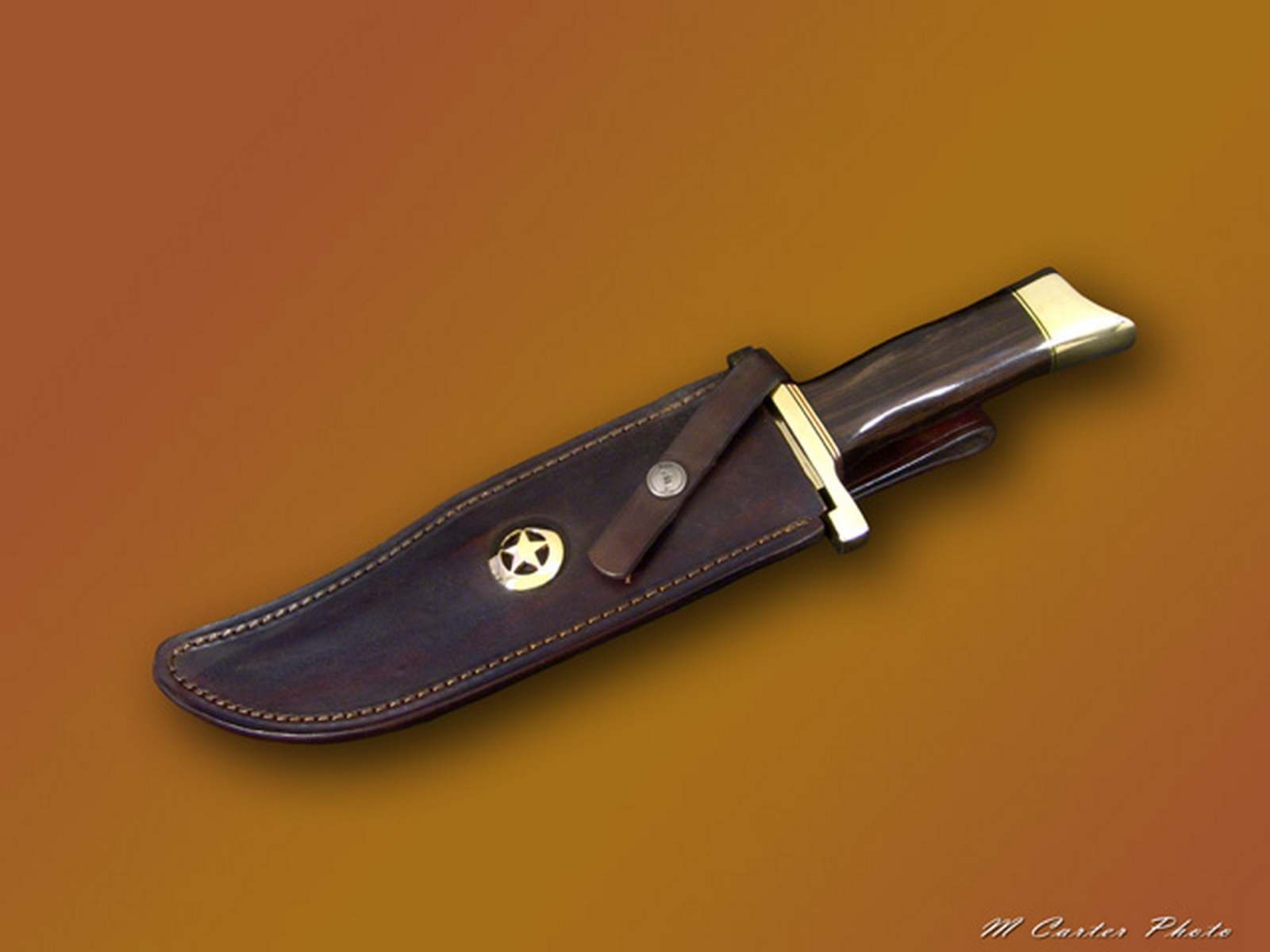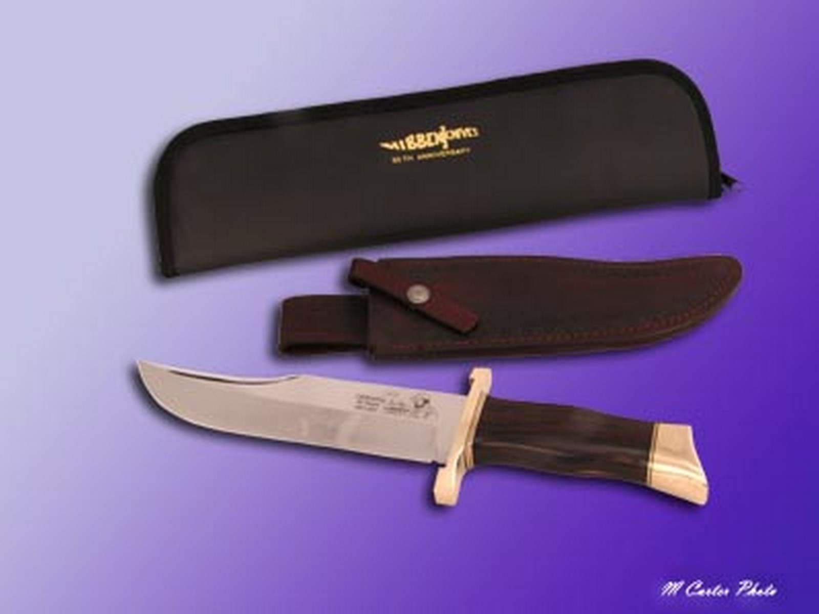 These beautiful knives feature a 9 1/2 inch blade of 5/16 inch thick steel. The overall length is 15 inches. The heavy brass guard and pommel complement the stunning Makassar Ebony handle. The blade is etched with a special anniversary logo featuring Gil’s signature and likeness. Each knife comes complete with a custom-fitted handmade leather sheath, a special anniversary nylon zippered pouch, and a personally signed certificate of authenticity.