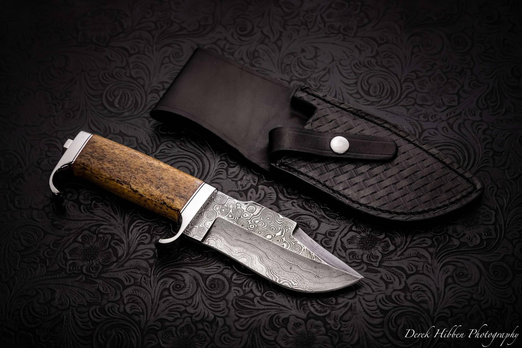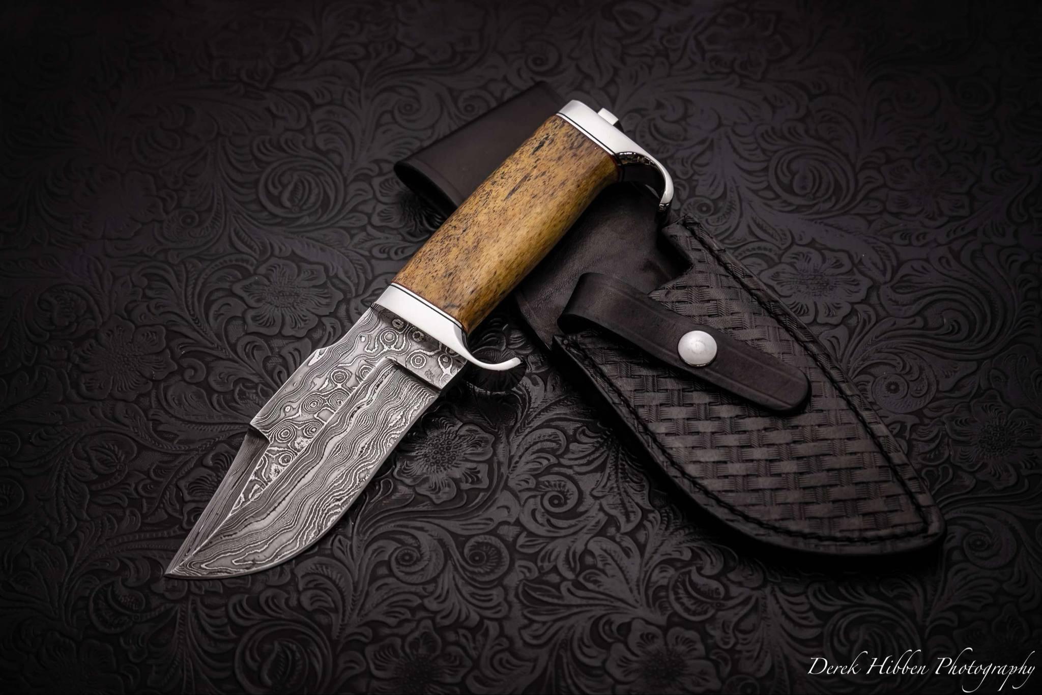 The Damascus “Elmer Keith” features a striking Damascus steel blade. This knife is 10 inches overall with a 5-inch blade, complemented by a sturdy stainless guard and pommel. The handle is crafted from unique seacow bone, adding a distinctive touch to its design. Each knife comes complete with a handmade leather sheath.