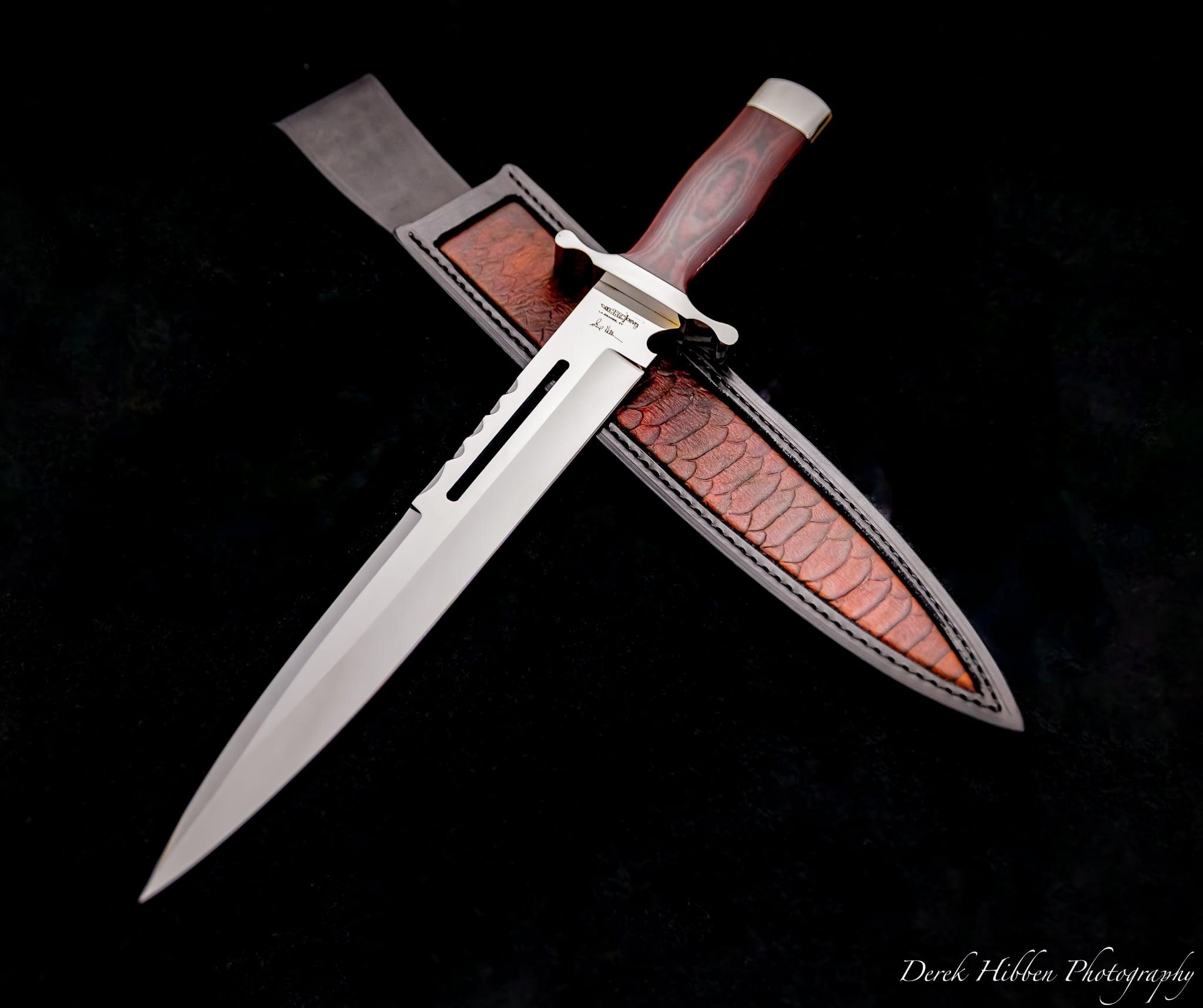 Legendary knifemaker Gil Hibben brings two icons of Hollywood action together in this custom fusion design. Merging the intimidating profile of the “Rambo III” knife with the sleek lethality of “The Expendables” Toothpick, this piece stands as a testament to Hibben’s cinematic legacy. The knife measures a staggering 17 1/2″ overall, featuring a 12″ mirror-polished blade that is 1 3/4″ wide. The construction is framed by a gleaming stainless steel guard and pommel, perfectly offsetting the deep tones of the Maroon Micarta handle. It also includes a handmade leather sheath featuring a genuine snake inlay, crafted by Derek Hibben.